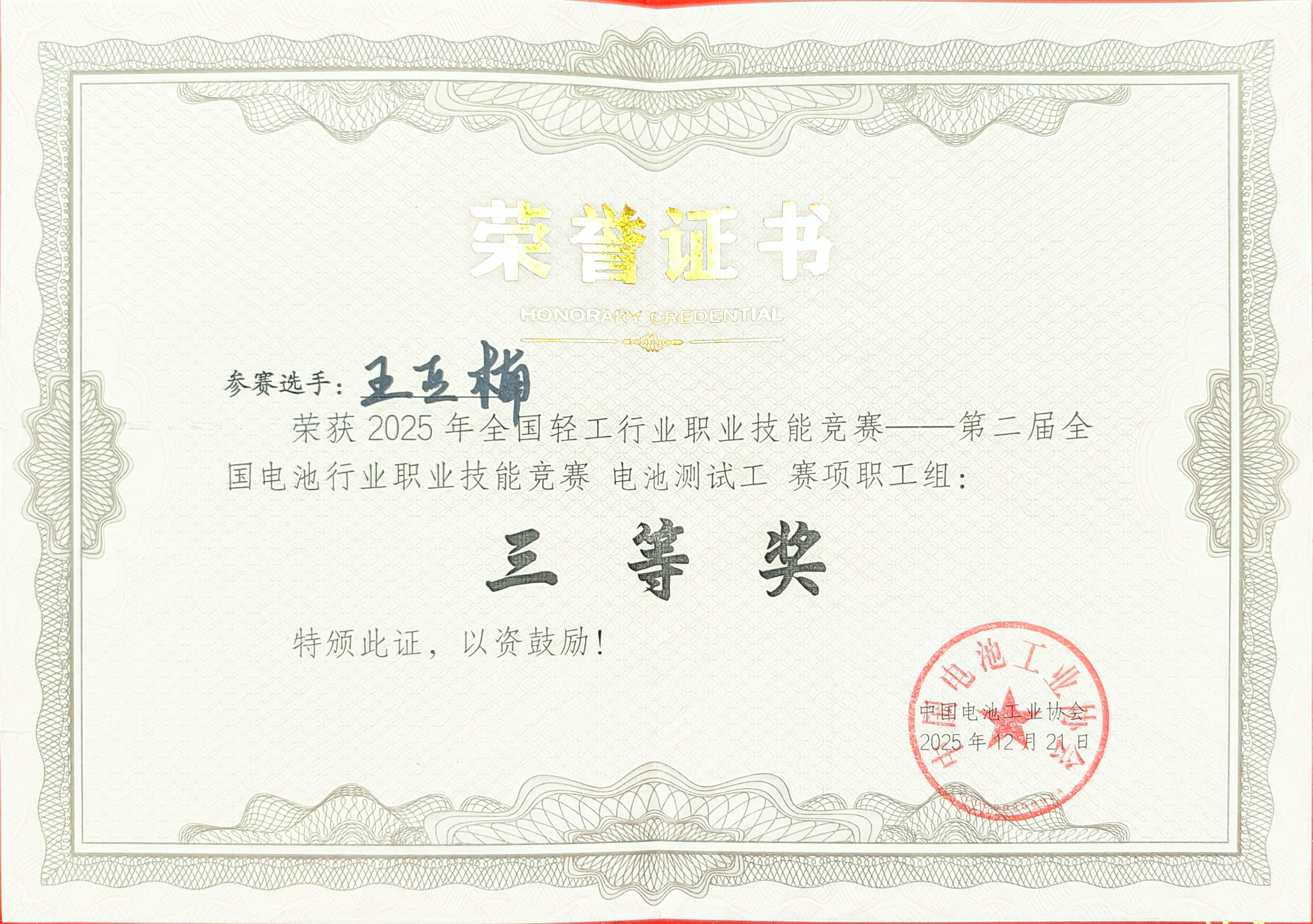 2025年12月21日,全国轻工行业职业技能竞赛——第二届全国电池行业职业技能竞赛“电池测试工”赛项全国决赛在深圳全至科技创新园圆满落幕。我院教师王亚楠历经层层选拔,从全国252名参赛选手中脱颖而出,最终以全国第13名的优异成绩斩获三等奖,展现了高校教师扎实的专业技能与行业实践能力。