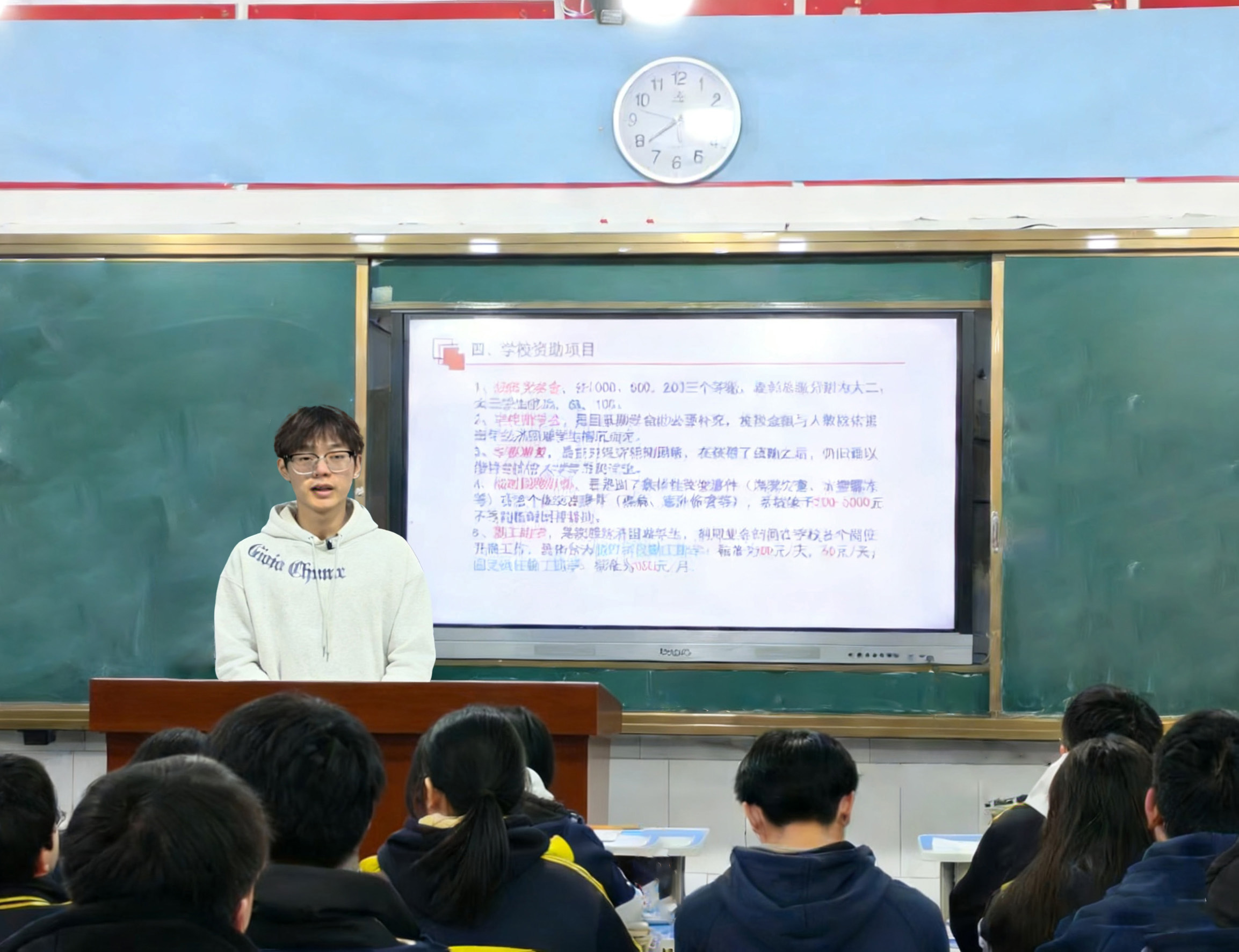 我还和他们聊起大学的样子,说那里有很大的操场、很多的书,鼓励他们现在好好努力,将来去看看更大的世界。学生们听得很认真,有的还小声问“上大学真的能有帮助吗”,我笑着点头说“只要你们想,国家会帮你们的”。这次宣讲让我觉得,把这些温暖的政策告诉学生们,切实将国家的温暖关怀送到学生心坎上。